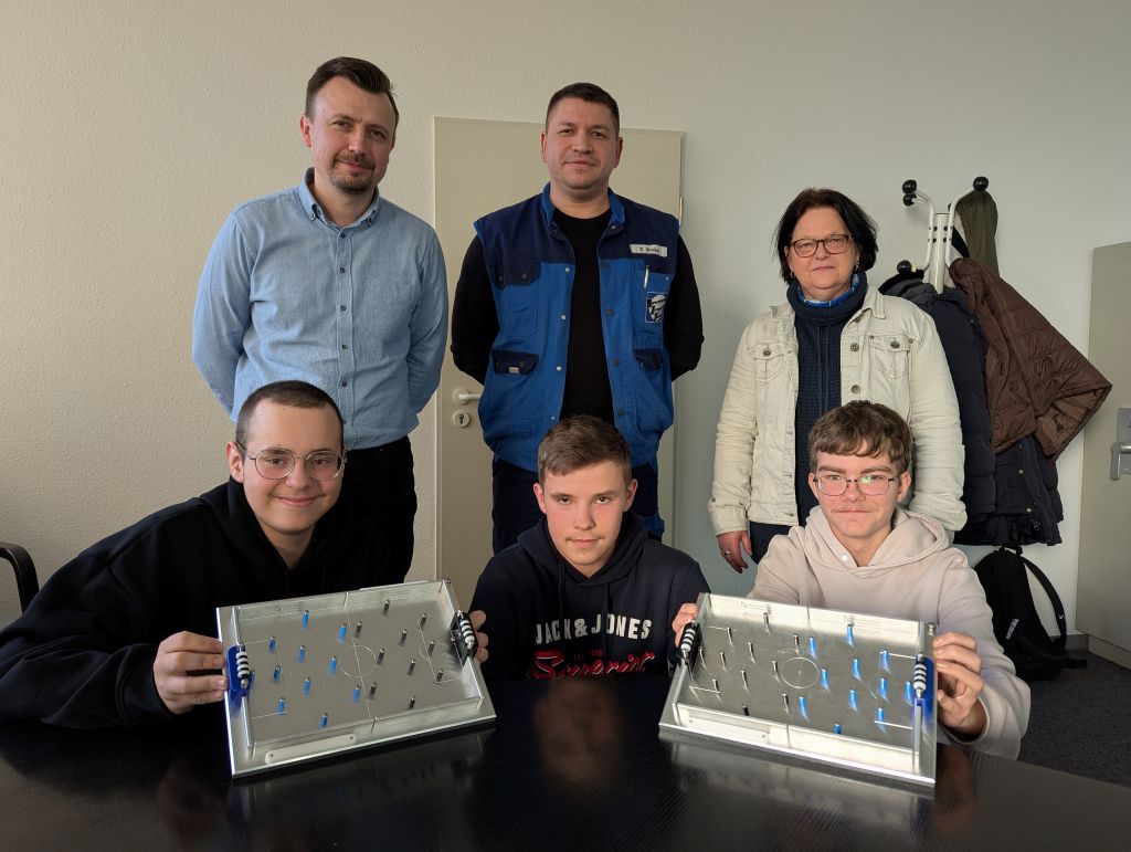 In einer Gruppe von drei Schülern bauten die Teilnehmenden unter Anleitung eines erfahrenen Betreuers ein Mini-Billard-Fußballspiel aus Metall- und Kunststoffbauteilen.