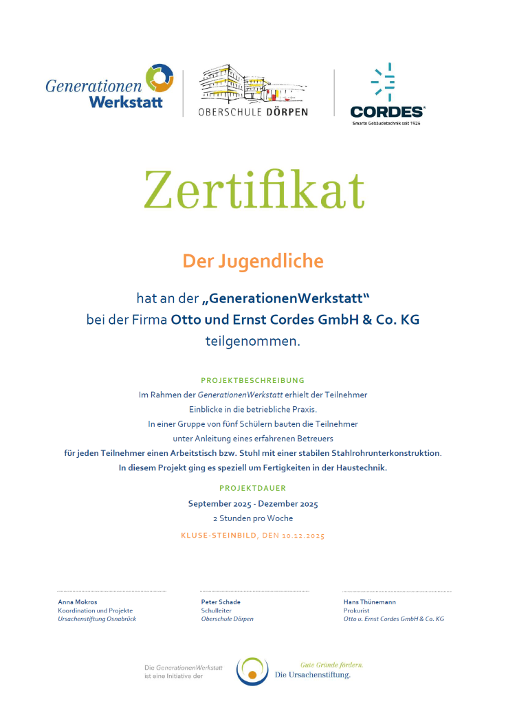 unter Anleitung eines erfahrenen Betreuers für jeden Teilnehmer einen Arbeitstisch bzw. Stuhl mit einer stabilen Stahlrohrunterkonstruktion.