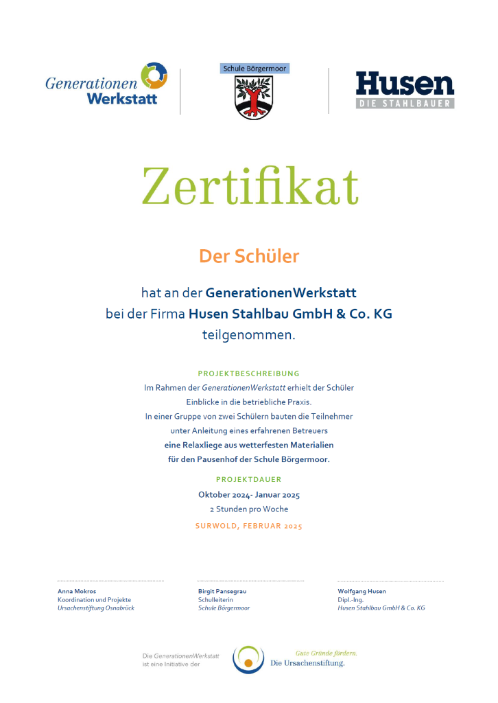 In einer Gruppe von zwei Schülern bauten die Teilnehmer unter Anleitung eines erfahrenen Betreuers eine Relaxliege aus wetterfesten Materialien für den Pausenhof der Schule Börgermoor.