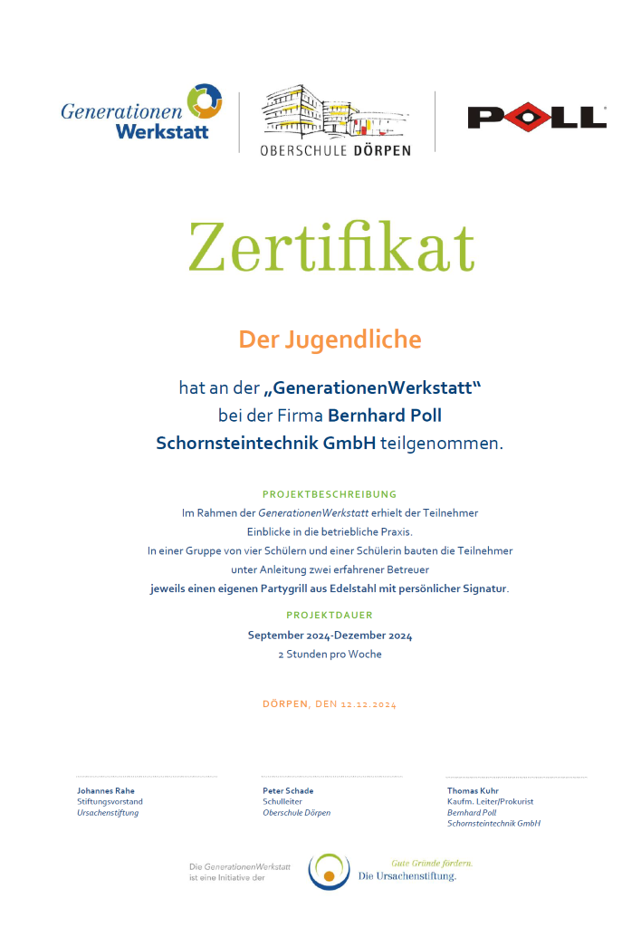 In einer Gruppe von vier Schülern und einer Schülerin bauten die Teilnehmer unter Anleitung zwei erfahrener Betreuer jeweils einen eigenen Partygrill aus Edelstahl mit persönlicher Signatur.