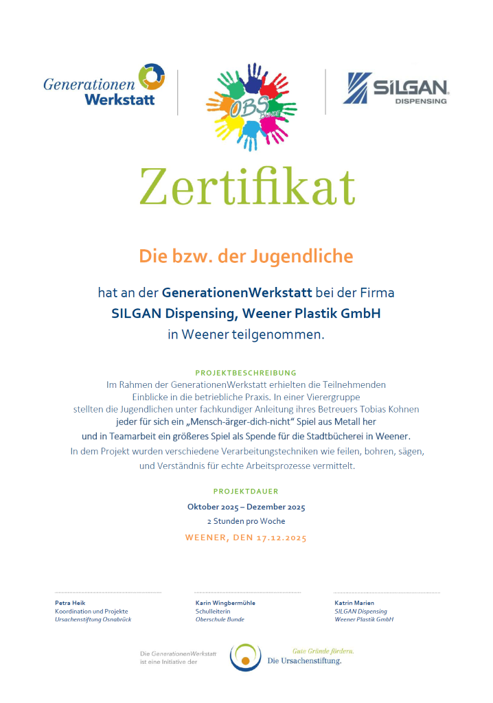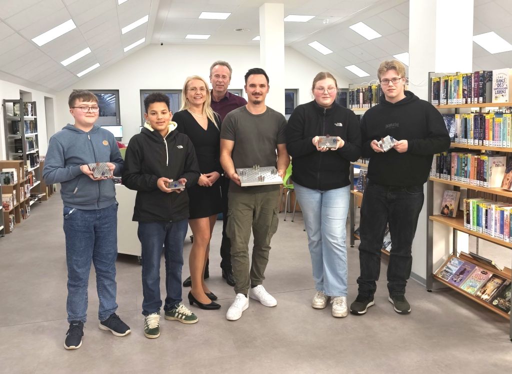 In einer Vierergruppe stellten die Jugendlichen unter fachkundiger Anleitung ihres Betreuers Tobias Kohnen jeder für sich ein „Mensch-ärger-dich-nicht“ Spiel aus Metall her und in Teamarbeit ein größeres Spiel als Spende für die Stadtbücherei in Weener.