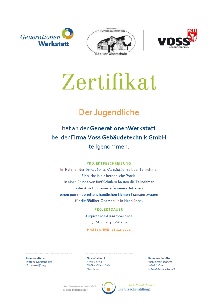In einer Gruppe von fünf Schülern bauten die Teilnehmer unter Anleitung eines erfahrenen Betreuers einen gummibereiften, handlichen kleinen Transportwagen für die Bödiker-Oberschule in Haselünne.